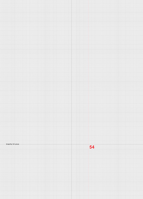 à distância, o cartaz é percebido como um plano cinza contínuo sobre o qual apenas o número 54 é legível. de perto, as demais informações (frases e logotipos) tornam-se legíveis, e o plano cinza revela-se como uma folha milimetrada, com algumas linhas em destaque marcando origem e intervalo.