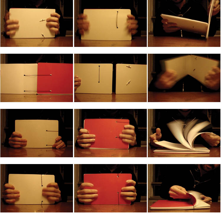 através do manuseio do conjunto, as ordens inicialmente oferecidas se revelam mutáveis e remontáveis. mutáveis porque, ao desdobrar e redobrar o volume, o leitor pode posicionar uma folha do miolo no topo das demais, como capa, alterando os inícios do livro sem mudar a intercalação das folhas. remontáveis porque o leitor pode facilmente desmontar por inteiro o volume e alterar a intercalação das folhas, além de inserir folhas novas. a encadernação participa da composição visual das páginas, com os furos posicionados em meio a duas áreas de leitura. uma delas é acessível com o simples folheio do livro. a outra exige que o leitor dobre e desdobre o volume para acessar informações nem sempre aparentes. o que se busca com esse ocultamento é – além de propiciar múltiplos modos de ler uma mesma página – colocar em evidência a materialidade física do objeto.